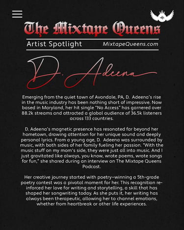 D. Adeena, a rising hip-hop pop artist from Avondale, PA, has captivated a global audience with her album "Echos of Parelthón" with over 130k Streams and her hit single “No Access,” now with over 31.2k streams. Based in Maryland, her unique sound and personal lyrics reflect her lifelong love for music, which began with poetry and family influences. Since her first recording session in 2018, she’s embraced both the artistry and business of her craft, balancing the demands of each to shape her own path. D. Adeena is stepping into her power, ready to inspire others to do the same.